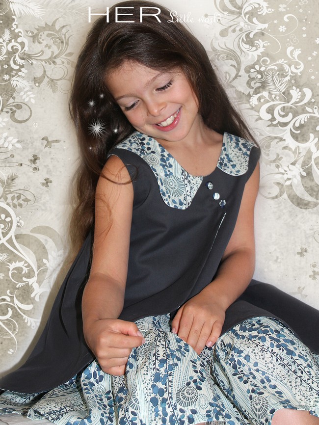 Je n’ai donc pas résisté très longtemps : mon choix s’est arrêté sur le patron de la robe « Appliquée : une jolie robe sage avec son petit col asymétrique. Un effet de superposition, et des finitions soignées. La robe avec son gilet intégré pour l’élégance… Un petit volant pour les petites filles qui aiment les fronces. Une jolie ouverture au dos avec un petit col. Une robe très bien finie puisque doublée. Et détail important, sous son petit air très sage, elle tourne ! »