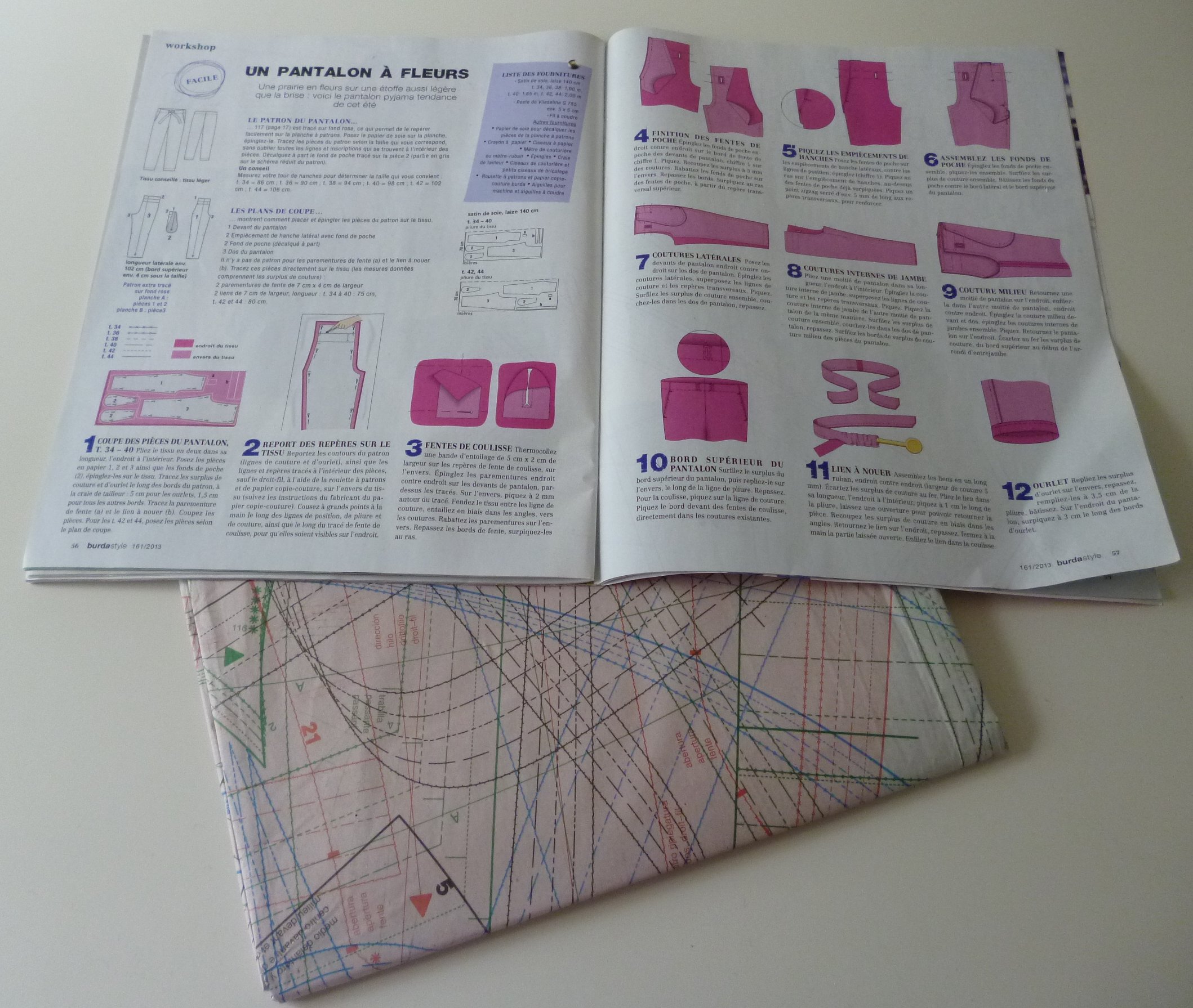 J’ai décidé de réaliser le pantalon que l’on voit en couverture du dernier Burda (mai 2013). « Il est de coupe pyjama, ligne très prisée cette saison et fait l’objet du workshop pour débutants dans notre magazine. » Il n’ y a que 5 pièces : devant et dos du pantalon, empiècement de hanche latérale avec fond de poche, fond de poche et lien à nouer.