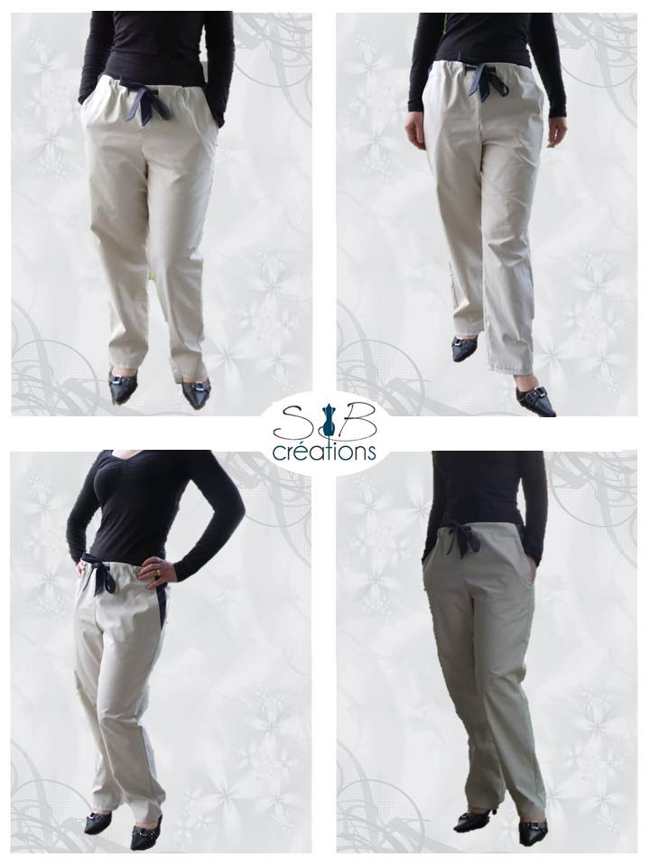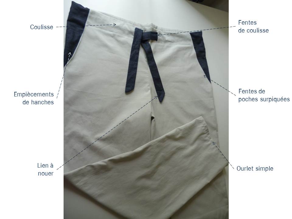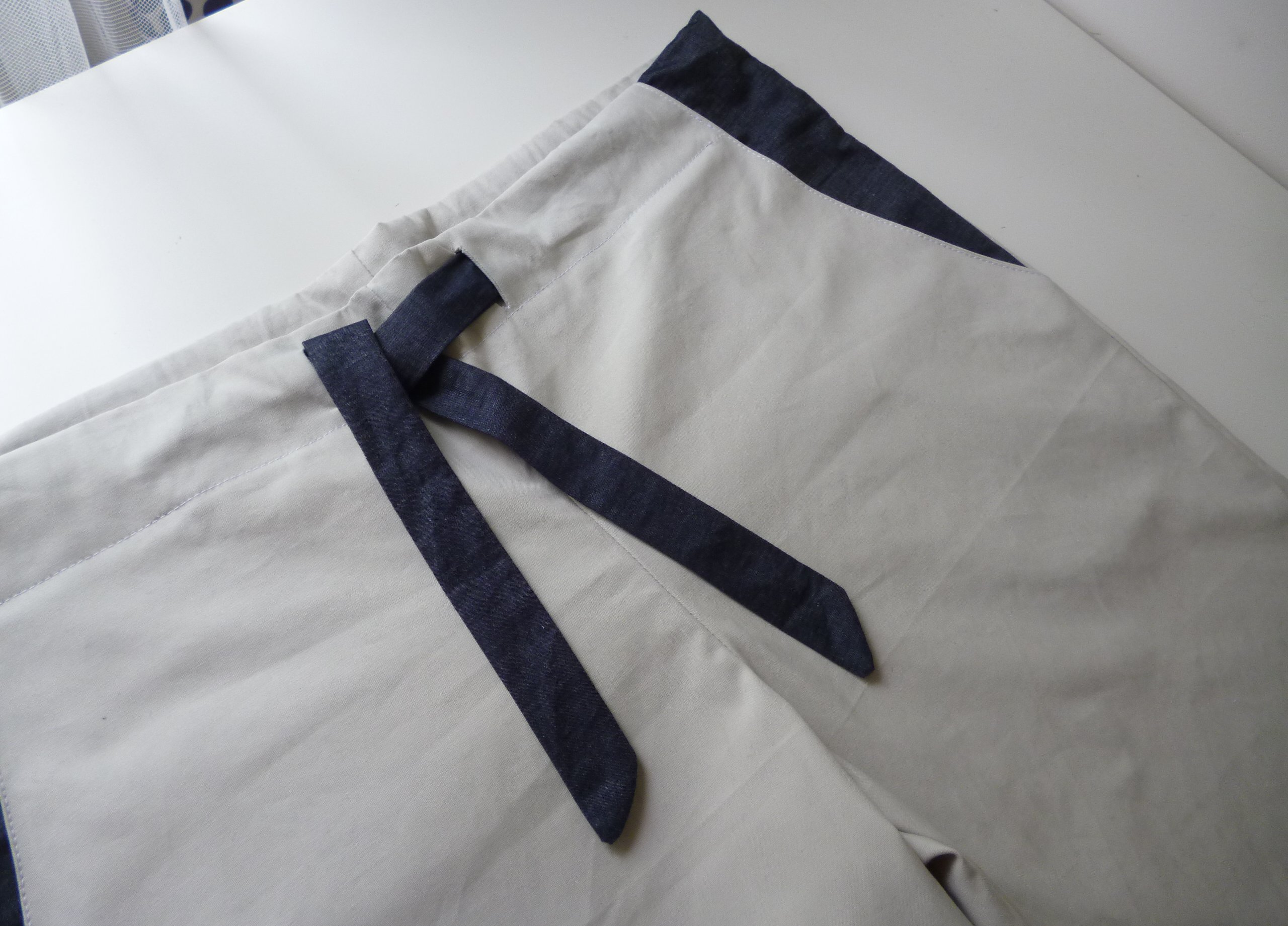J’ai préféré réaliser une toile avant de couper dans mon tissu afin de vérifier non seulement les mesures, le tombé mais aussi le montage du pantalon. J’ai choisi du coton écru assez épais pour ce pantalon et ai décidé de contraster les empiècements de hanches, les fonds de poche et le lien à nouer avec un coton en jean et voilà mon pantalon d’été, décontracté : idéal pour les week-ends.
