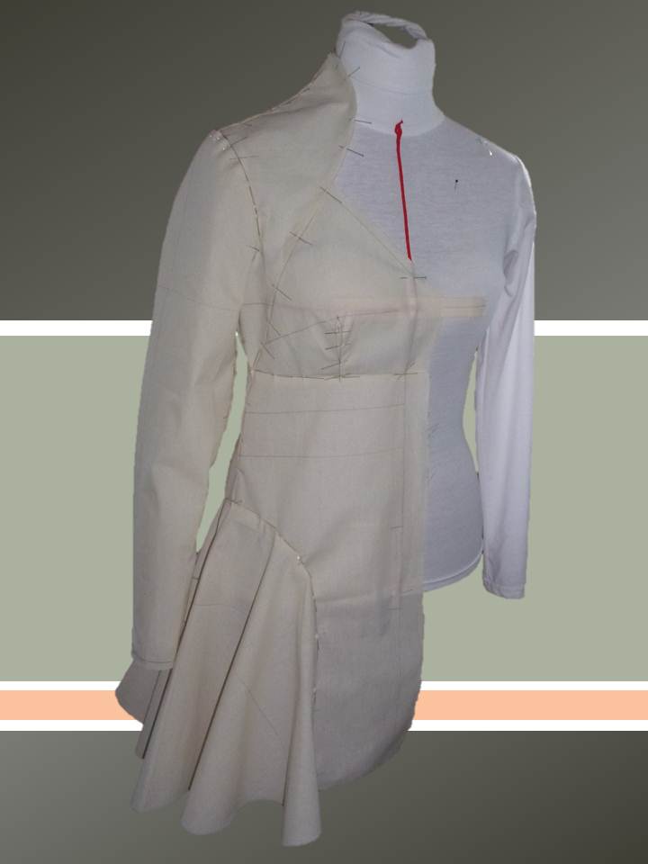 Les difficultés de cette tenue ont été le moulage du col montant (col cygne), la robe sans pince à la taille, les godets de la partie évasée de la jupe et la manche coudée.