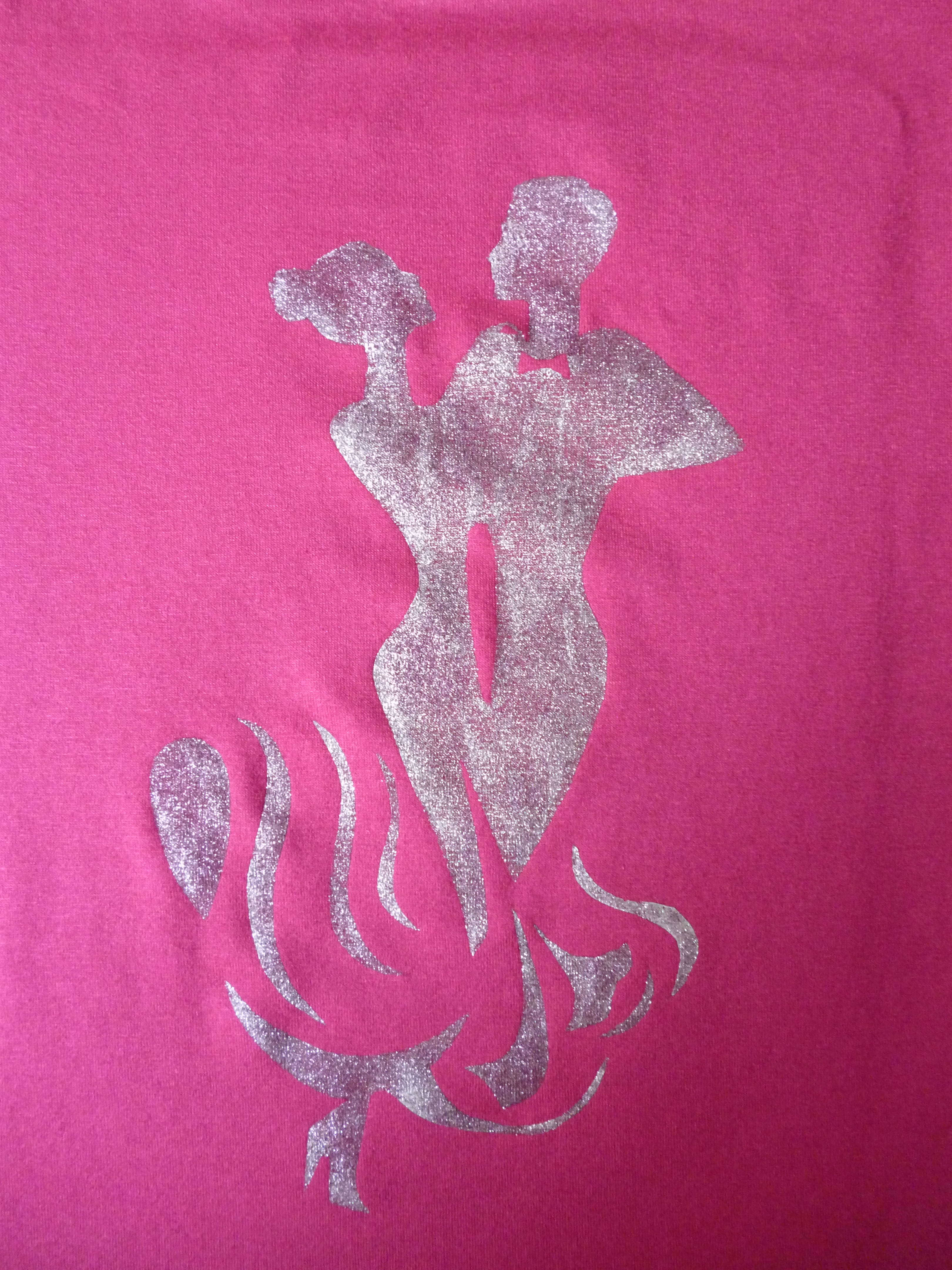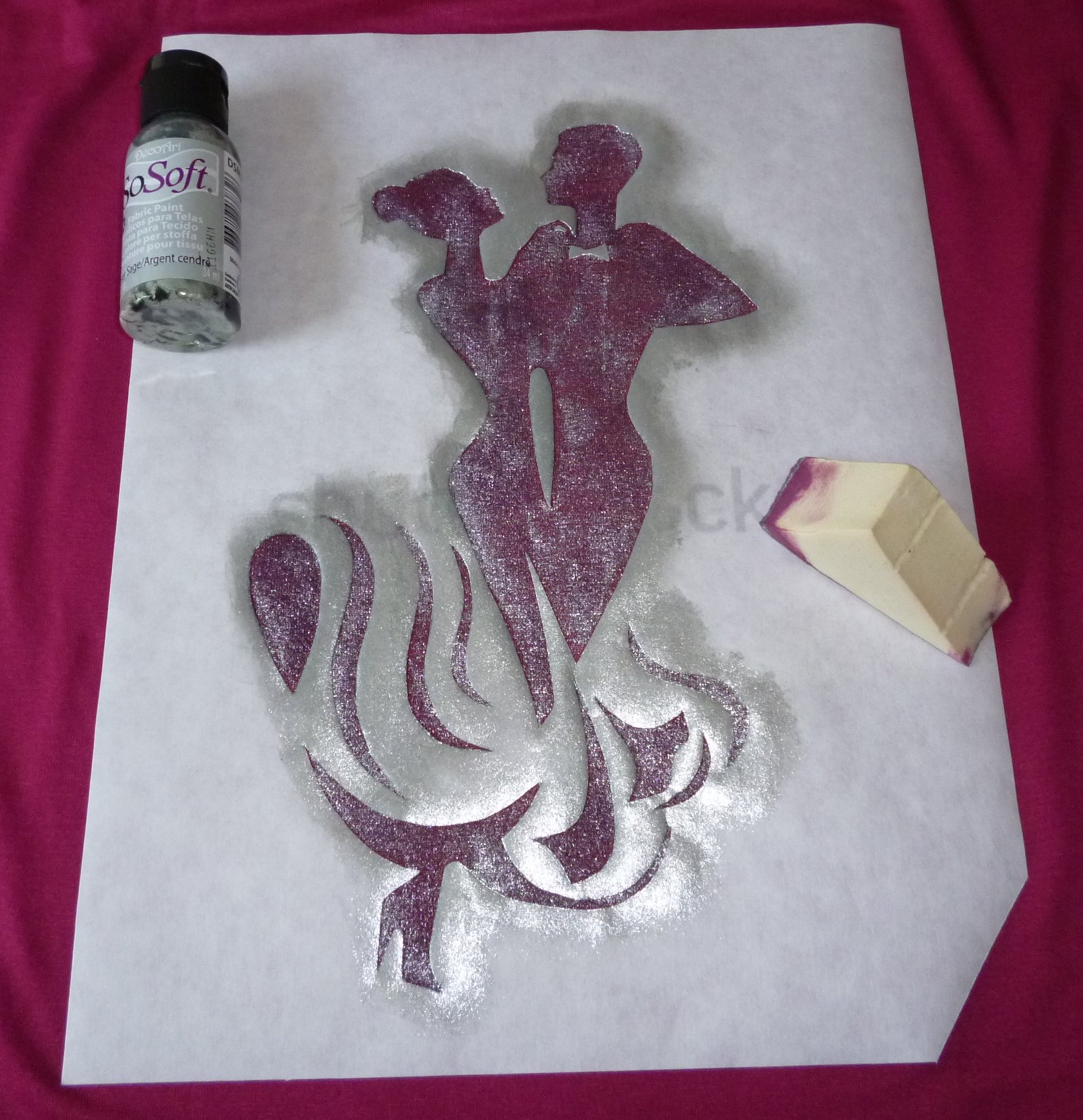 Pour ce qui de la peinture textile, j’ai choisi la silouhette d’un couple de danseurs que j’ai imprimé directement sur la feuille de freezer paper.