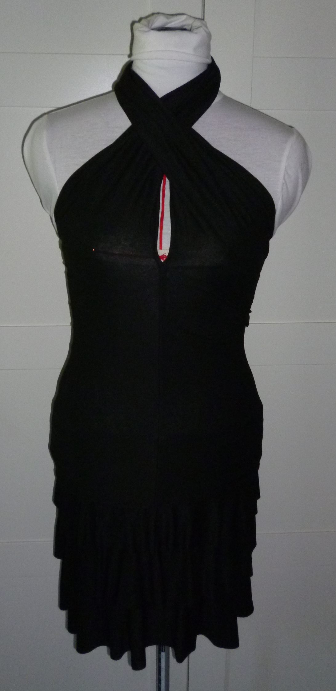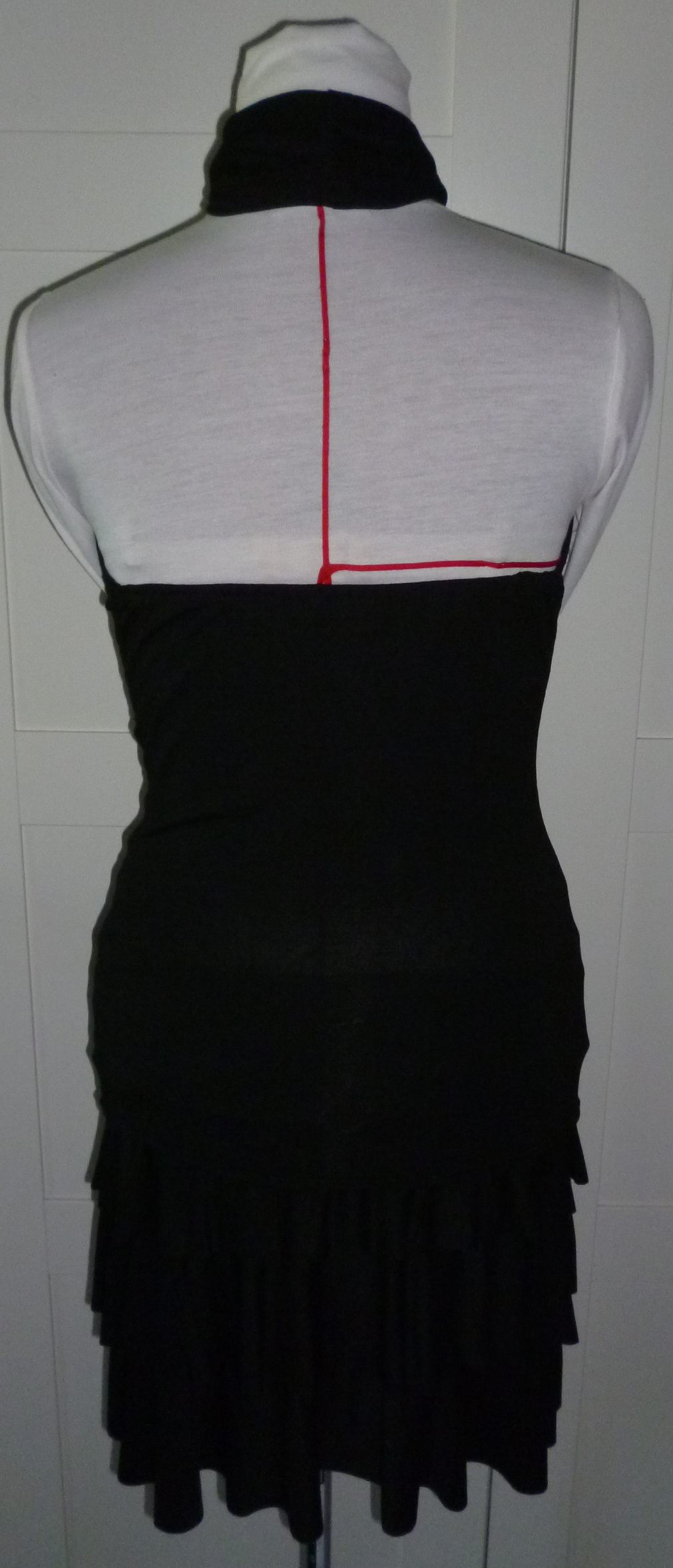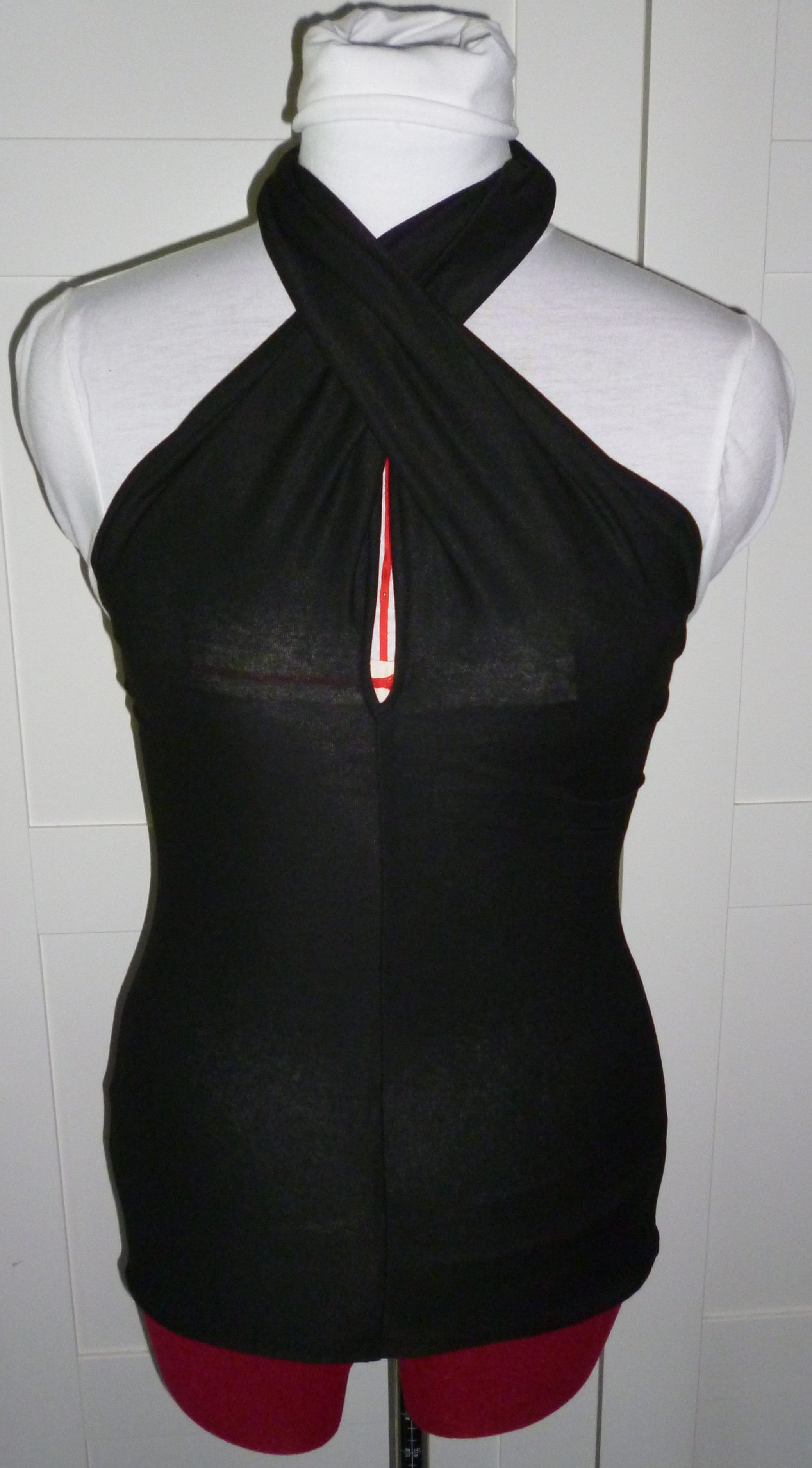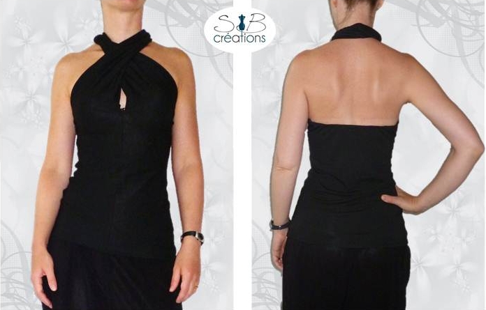 Le dos nu est élastiqué et il y a un joli drapé sur le devant au niveau de l’encolure. Je trouve ce top très seyant, idéal pour l’été ou pour une soirée. Réalisé en taille 36 sans marge de couture dans le même jersey que ma jupe précédemment présentée. Ce top n’est pas doublé, il y a juste un rentré en ce qui concerne la finition des bords.