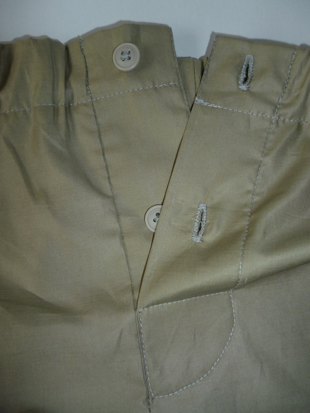 Voici donc la première réalisation de ce livre en taille 44 et dans du voile de coton de couleur kaki. J’ai entoilé, comme conseillé dans le livre, la patte de boutonnage et la parementure de braguette. Ca permet effectivement de renforcer par la suite la couture de la boutonnière.