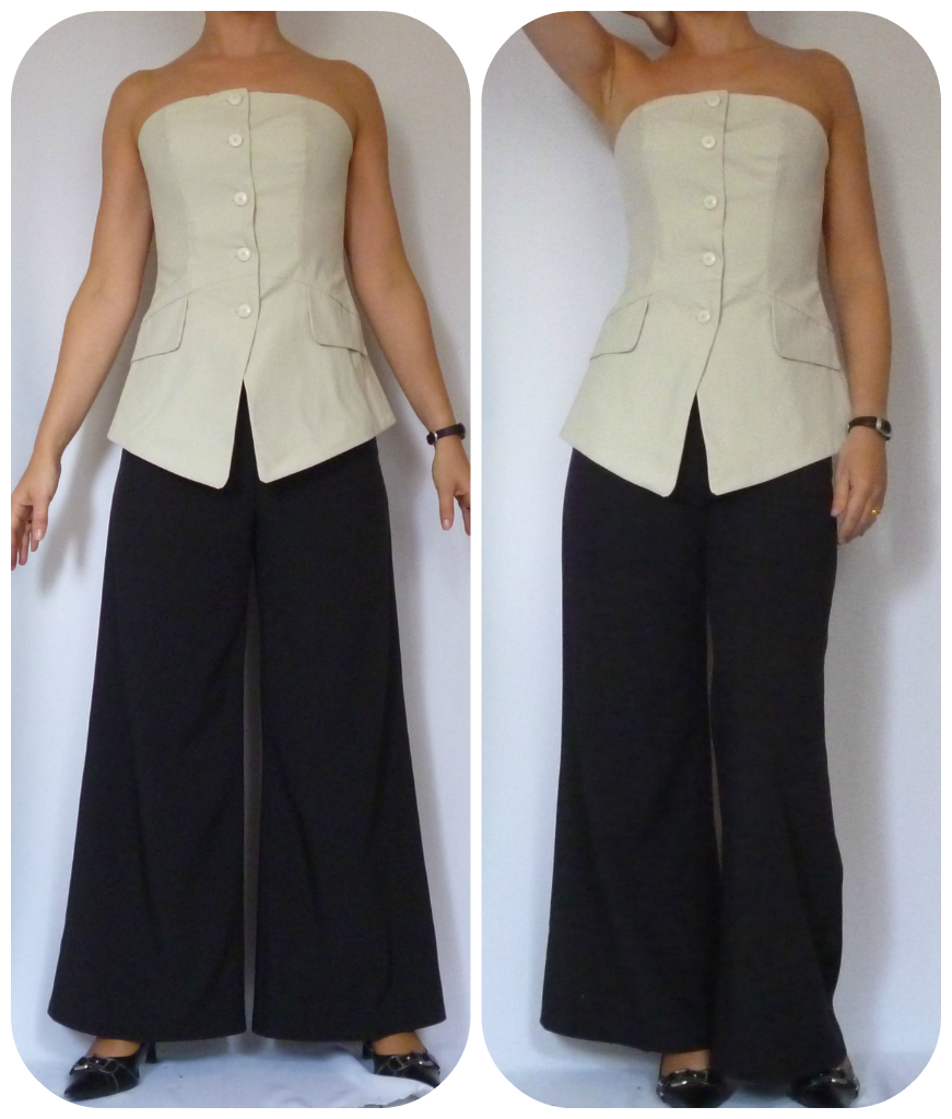 Dans ma lancée, j’ai réalisé un deuxième pantalon, noir cette-fois-ci et coupé dans un polyester toujours de chez Stop tissu. J’ai supprimé la couture des découpes verticales sur le devant et le résultat est parfait. Je l’ai associé avec mon bustier précédemment cousu et j’en suis plutôt contente !
