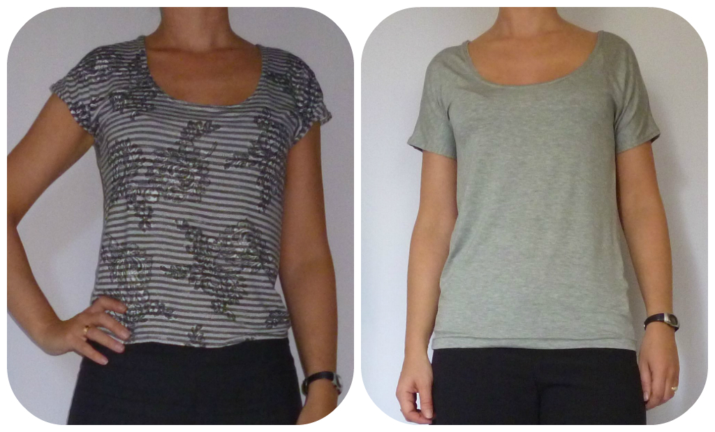 Je le porte avec un t-shirt rayé dont le patron gratuit est visible ici. J’ai néanmoins apporté de nombreuses modifications au patron (réduction de l’ampleur et de la longueur notamment). Cousu une seconde fois dans un beau jersey de coton gris (manches allongées, longueur du t-shirt également). Finitions à l’aiguille double.
