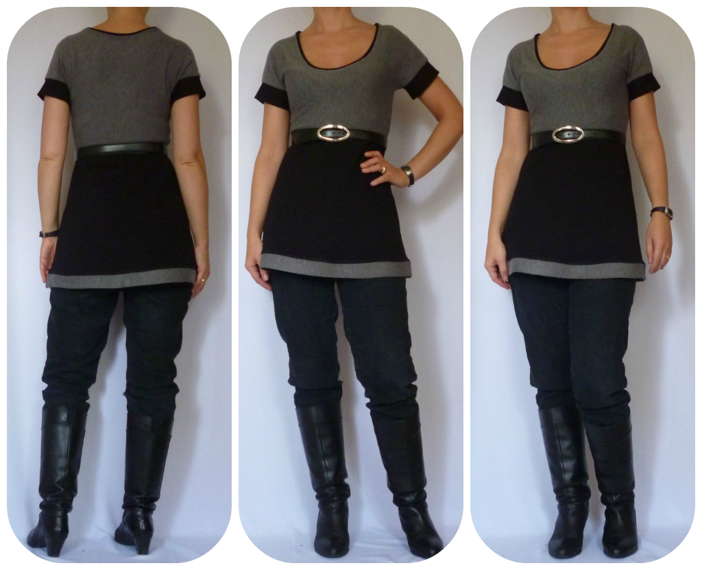 Il s’agit d’une tunique toute simple dont le patron est home-made. Une tunique taille haute bicolore avec petites manches, encolure ronde et bien décolletée, le tout réalisé à la surjeteuse et à l’aiguille double.
