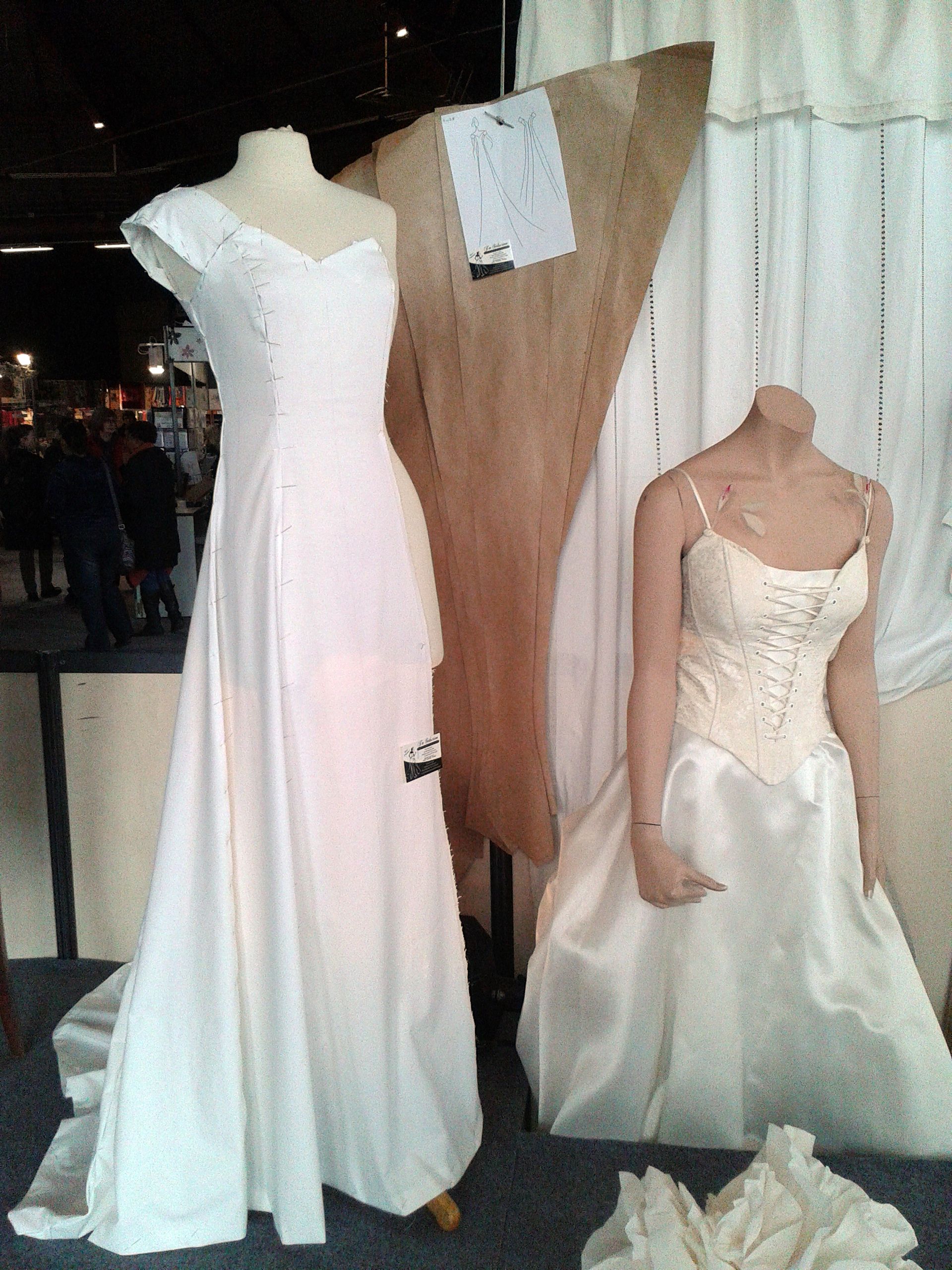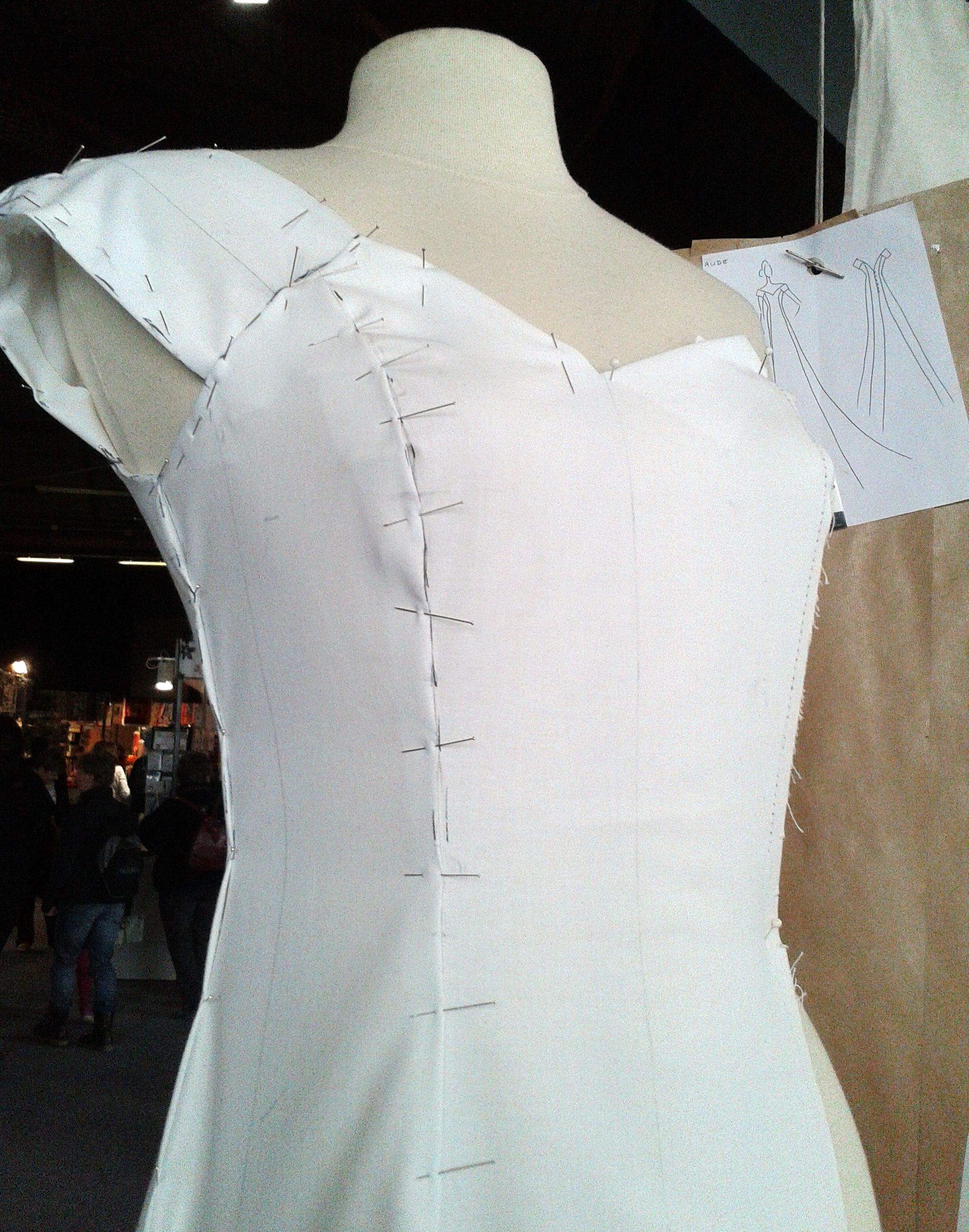 Il s’agissait d’un stand de couture pour la confection de robes de mariées. On y retrouve entre autres l’esquisse d’origine, le patron en papier kraft et le moulage de la robe sur mannequin :