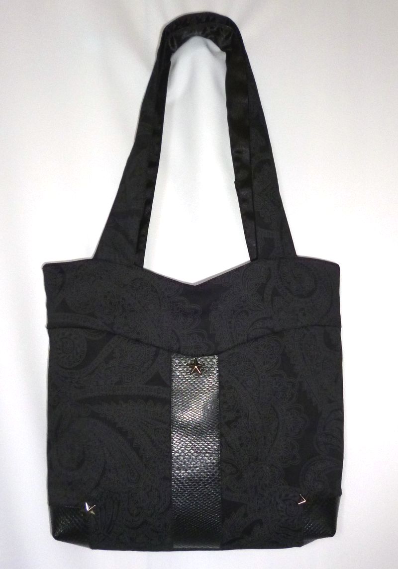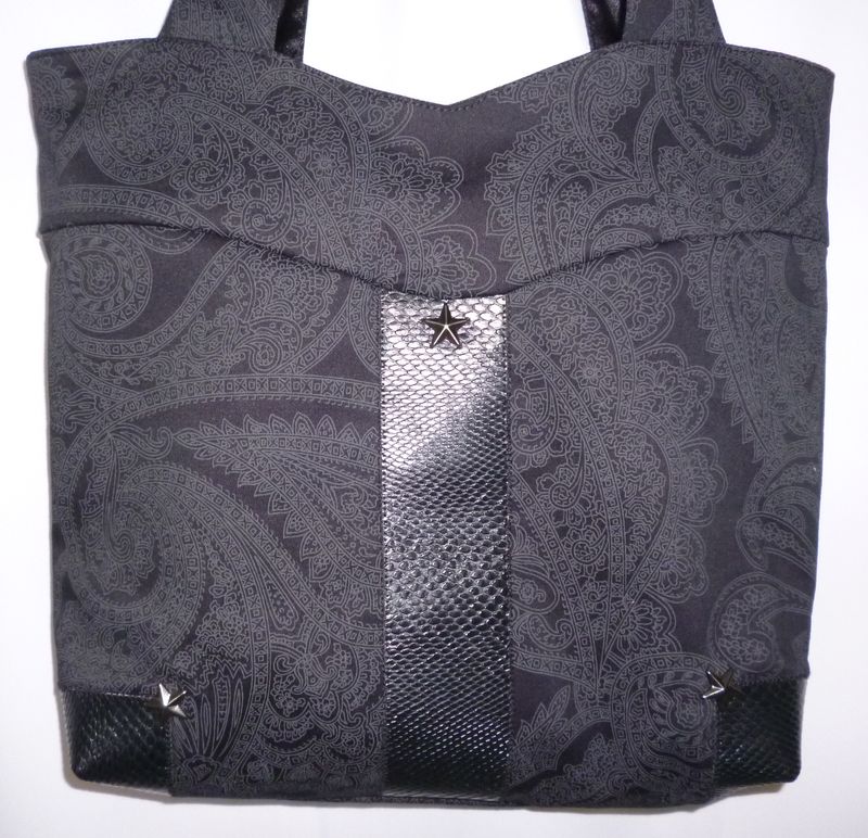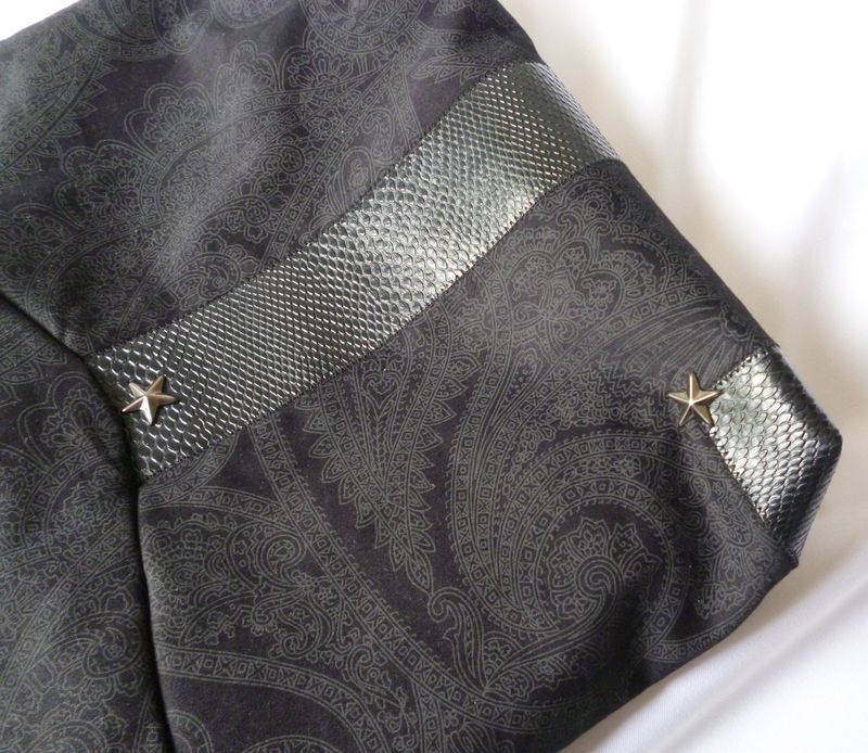 Pour ce défi, j’ai fait un clin d’oeil au patron Alex (toujours de la marque Sacôtin) en y ajoutant des coins-renforts et une bande contrastante sur le devant. Ces appliqués sont en simili-cuir et soulignés de clous en métal de formes étoiles qui s’appliquent facilement grâce à ses griffes perforantes qu’il suffit ensuite de replier sur l’arrière.