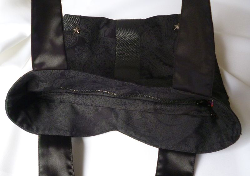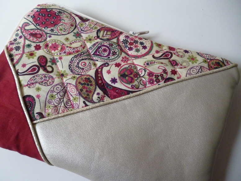 Les détails que j’ai appréciés : le design bien sûr, le matelassage de la pochette, la pose de passepoil doré, la fermeture éclair posée en courbe (pas du tout évidente à poser…) :