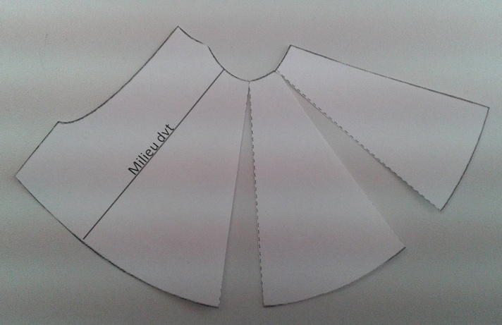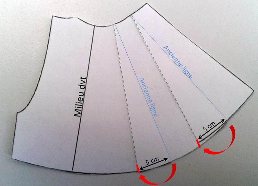 Pour celles que ça intéressent, voici comment j’ai procédé. Ca a été un bon exercice de coupe à plat ! Il s’agit ici de ma méthode personnelle qui me semblait logique pour faire cette transformation du modèle, mais peut-être existe-t-il une autre façon de faire…