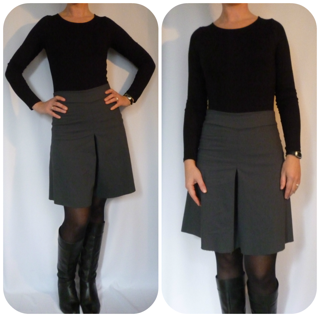 Je trouve que la version du patron te va parfaitement bien, c’est le style de la jupe culotte… peut-être qu’elle serait mieux avec un pull plus large qui viendrait se poser par dessus pour casser la taille marquée.
