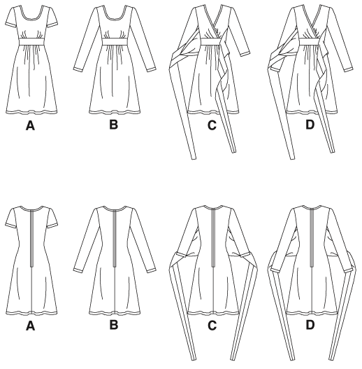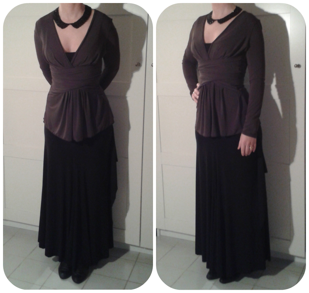 J’ai opté pour la version D : cache-coeur, lien à nouer au dos et manches longues. Je n’ai pas posé de fermeture éclair au dos étant donné l’élasticité de mon jersey. La jupe est plissée sur le devant au niveau de la ceinture. Idem pour le corsage.