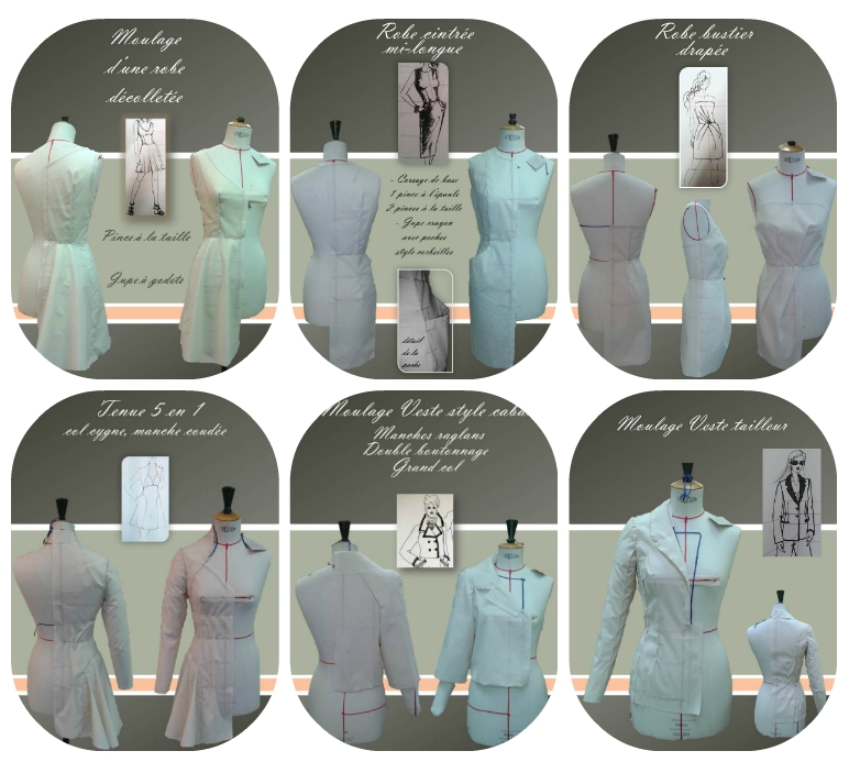 – Cours de toilisme-modélisme : 8 modèles dont 2 jupes (réalisation 2012), 4 robes, 2 vestes avec étude de cols (montant, claudine, roulant, col style caban, tailleur), manches (classiques, coudées, raglans, tailleurs). Sans oublier la réalisation d’un bras !