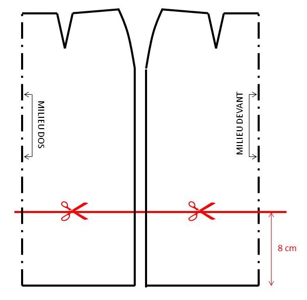 1/ Déterminer la longueur de la jupe : je l’ai raccourcie de 8 cm (toujours raccourcir depuis la ligne d’ourlet et non depuis celle de la taille).