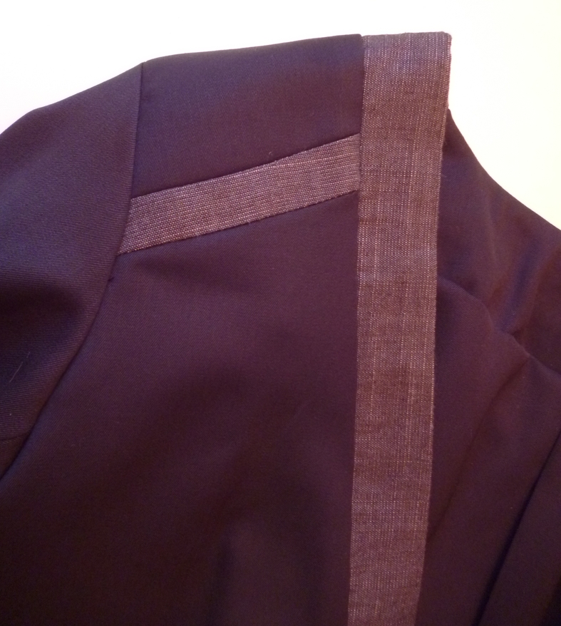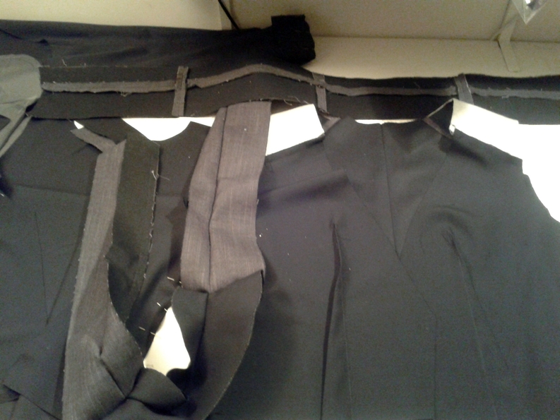 Je n’ai pas tout de suite compris la logique du montage de la veste, du coup je faisais les choses un peu machinalement sans trop comprendre le pourquoi du comment. En fait il a fallu coudre tous les éléments séparément, le corps de la veste d’un côté, les ourlets et les enformes de l’autre. Idem pour le col tailleur.