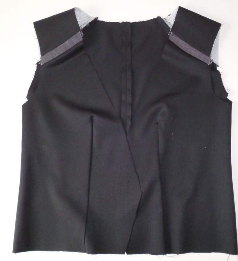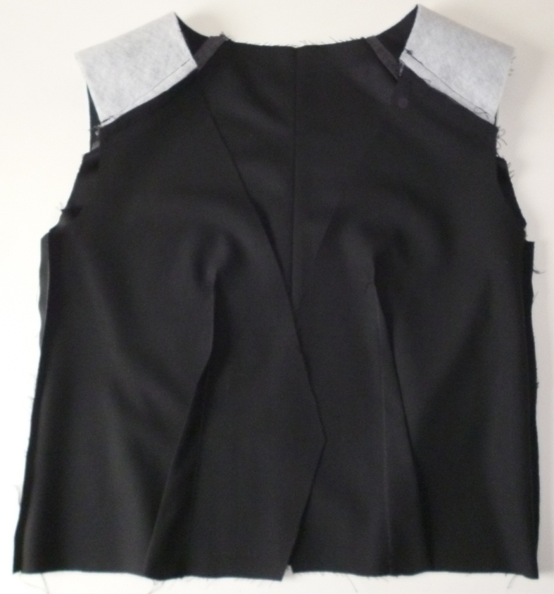 Ci-dessous le corps de la veste (sur l’envers) avec les empiècements d’épaules (ouatine thermocollante à la place des épaulettes, très bonne idée que je garde !) :