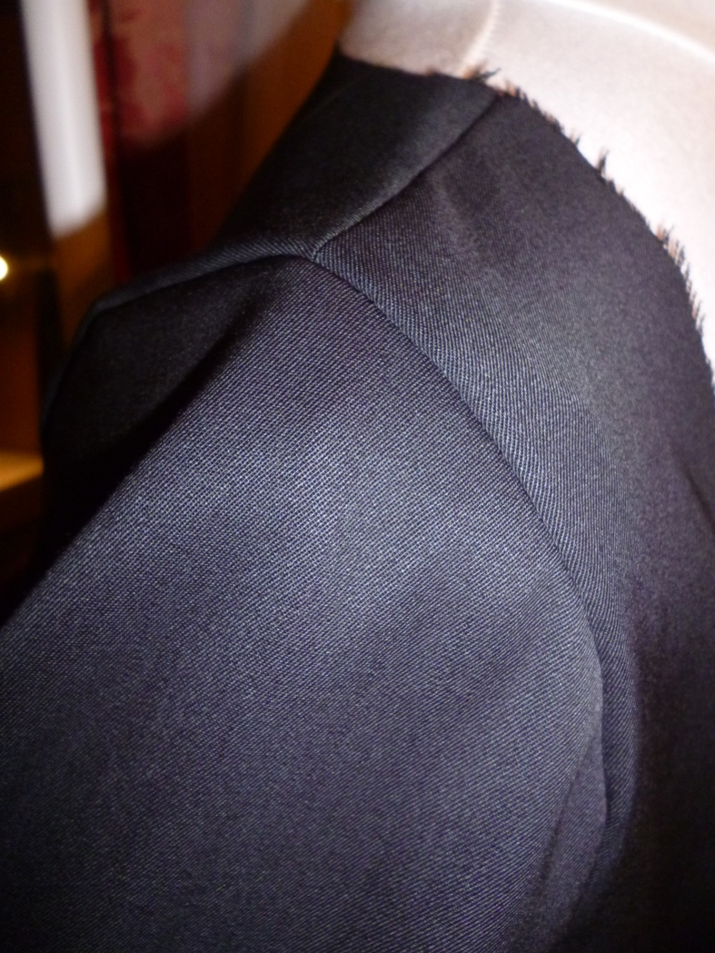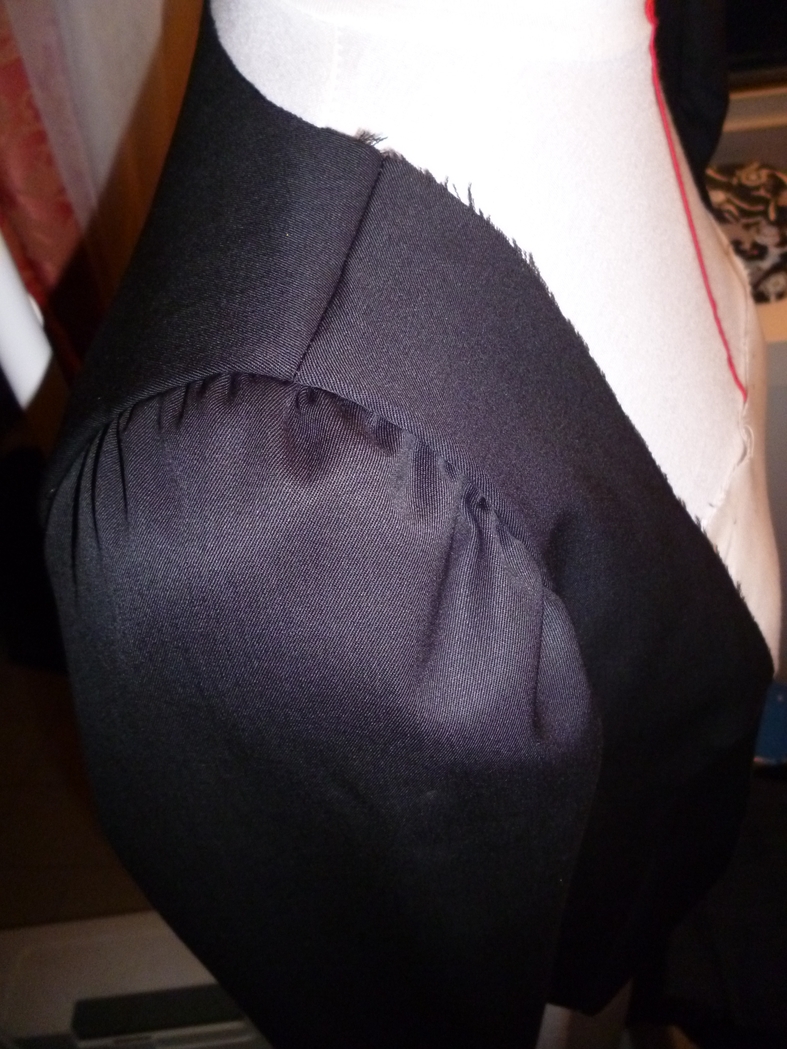 Ensuite il a fallu procéder au montage de la doublure (ça ok, no problem) et des manches… Ayant choisi un tissu fin (trop fin…) pour cette veste, j’ai eu quelques difficultés pour résorber l’embus de la tête de manche. J’ai eu beau soutenir avec deux fils de fronces, rien à faire, impossible d’avoir une tête de manches nette et sans fronces. La voici sur la doublure, une catastrophe, n’est-ce-pas ?!