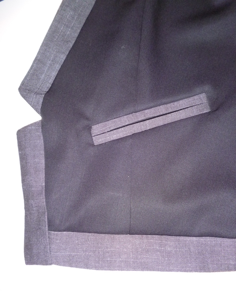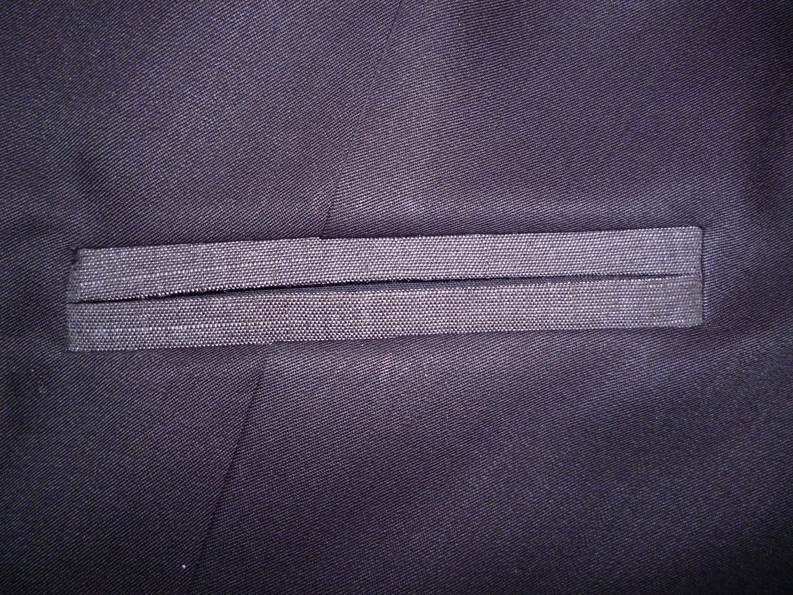 Le patron prévoyait de faire des fausses poches à doubles passepoils mais j’ai préféré faire des vraies. Ca m’a permis de revoir la technique étudiée en cours. Pour celles que ça intéresse, la méthode est très bien expliquée ici !