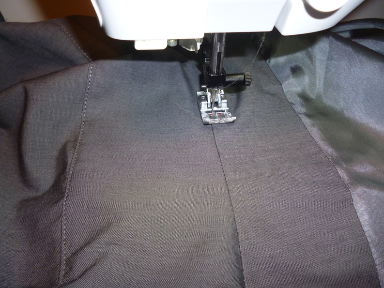 Je fais toujours une piqûre à 1 mm du bord pour bien maintenir la parementure vers l’intérieur. Il faut pour cela bien coudre et la parementure et les valeurs de couture ensemble, j’en parle ici.