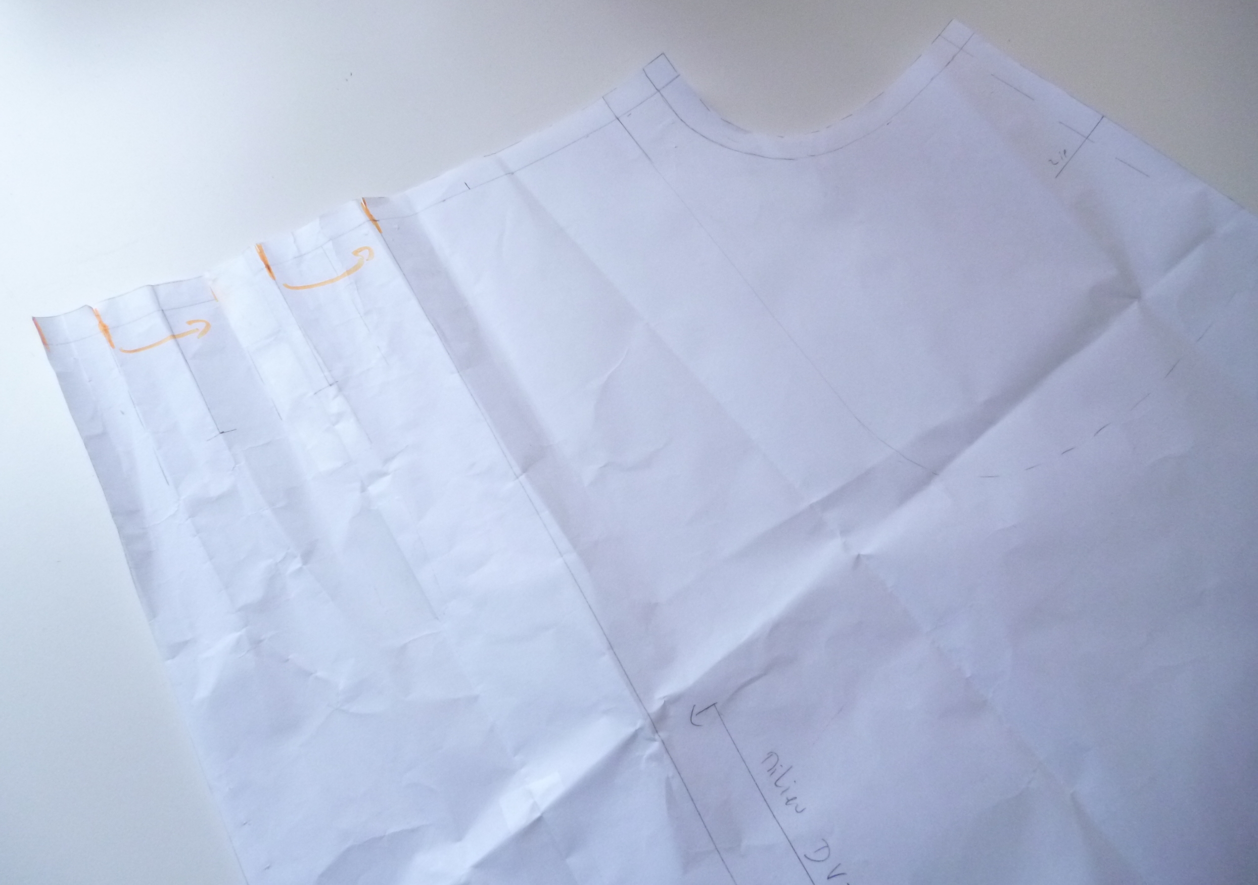 J’ai repris le patron de la jupe évasée dont j’ai parlé ici puis ai procédé aux diverses transformations souhaitées. J’ai tout d’abord dessiné l’empiècement puis les poches. J’ai ensuite ajouté au milieu devant une dizaine de centimètres pour me permettre de créer mes quatre petits plis. J’ai mis des crans de montage aux endroits propices (entrée de poche, zip, milieu devant, plis…) qui permettront ensuite de faciliter l’assemblage des différentes pièces.