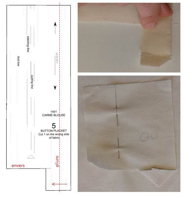 Je souhaite par ailleurs apporter une précision sur la patte de boutonnage. Pour bien former la pointe de la patte, voici comment je procède : je plie endroit contre endroit les deux bord, je couds à 1 cm, je dégarnis l’angle, j’ouvre la couture au fer puis je retourne le capucin. Le résultat est net, précis bref impeccable !
