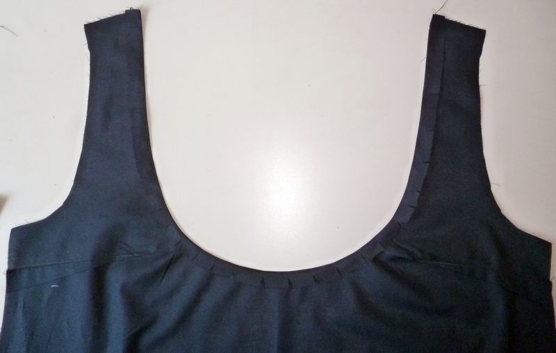 Pour l’encolure, il a fallu faire une piqûre de maintien à 1,5 cm, cranter puis retourner ces marges sur l’envers :
