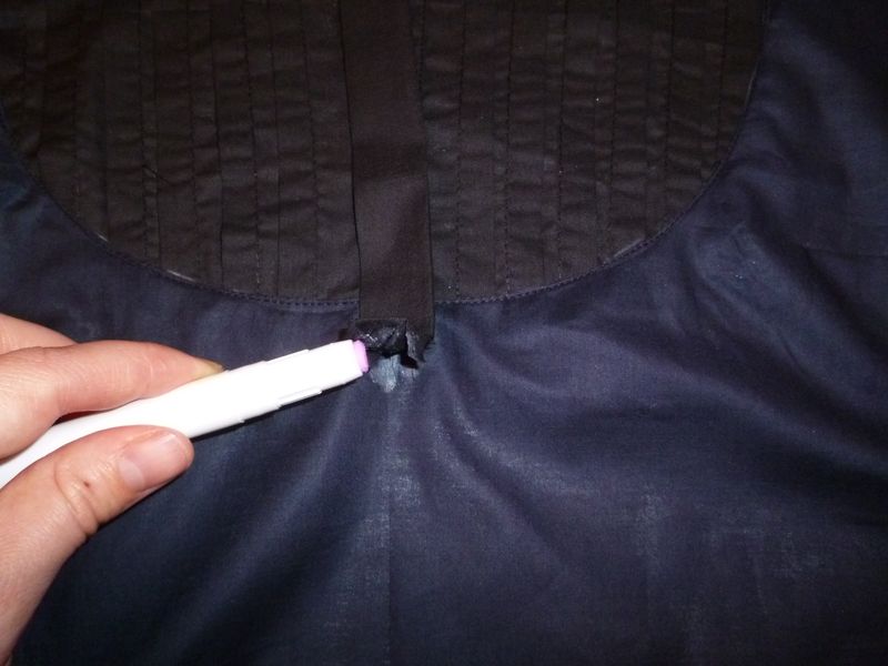 Pour faciliter la couture de la patte de boutonnage, j’ai encollé la patte au niveau du capucin. J’avais procédé de la même manière pour ma chemise Mythique :