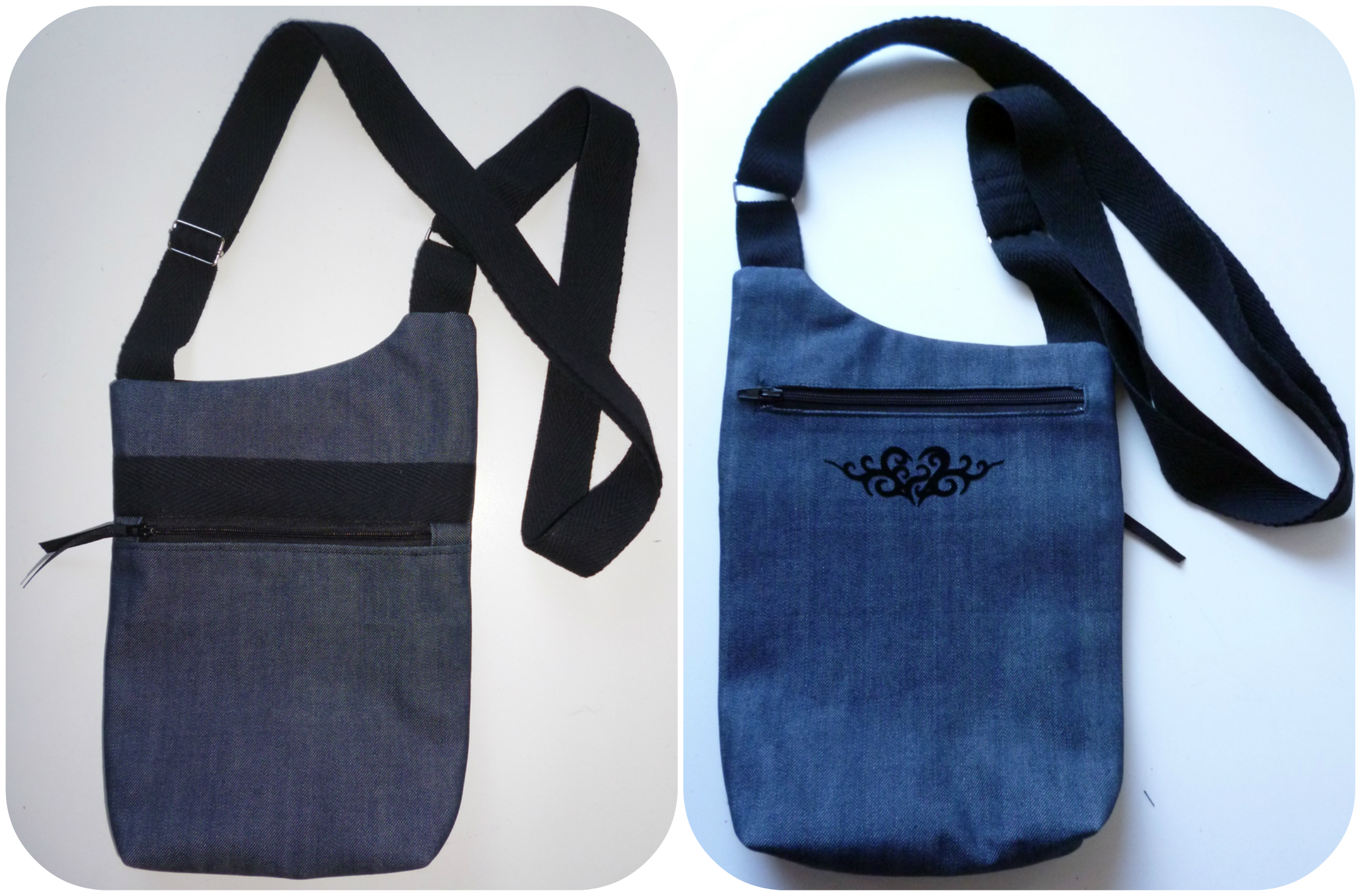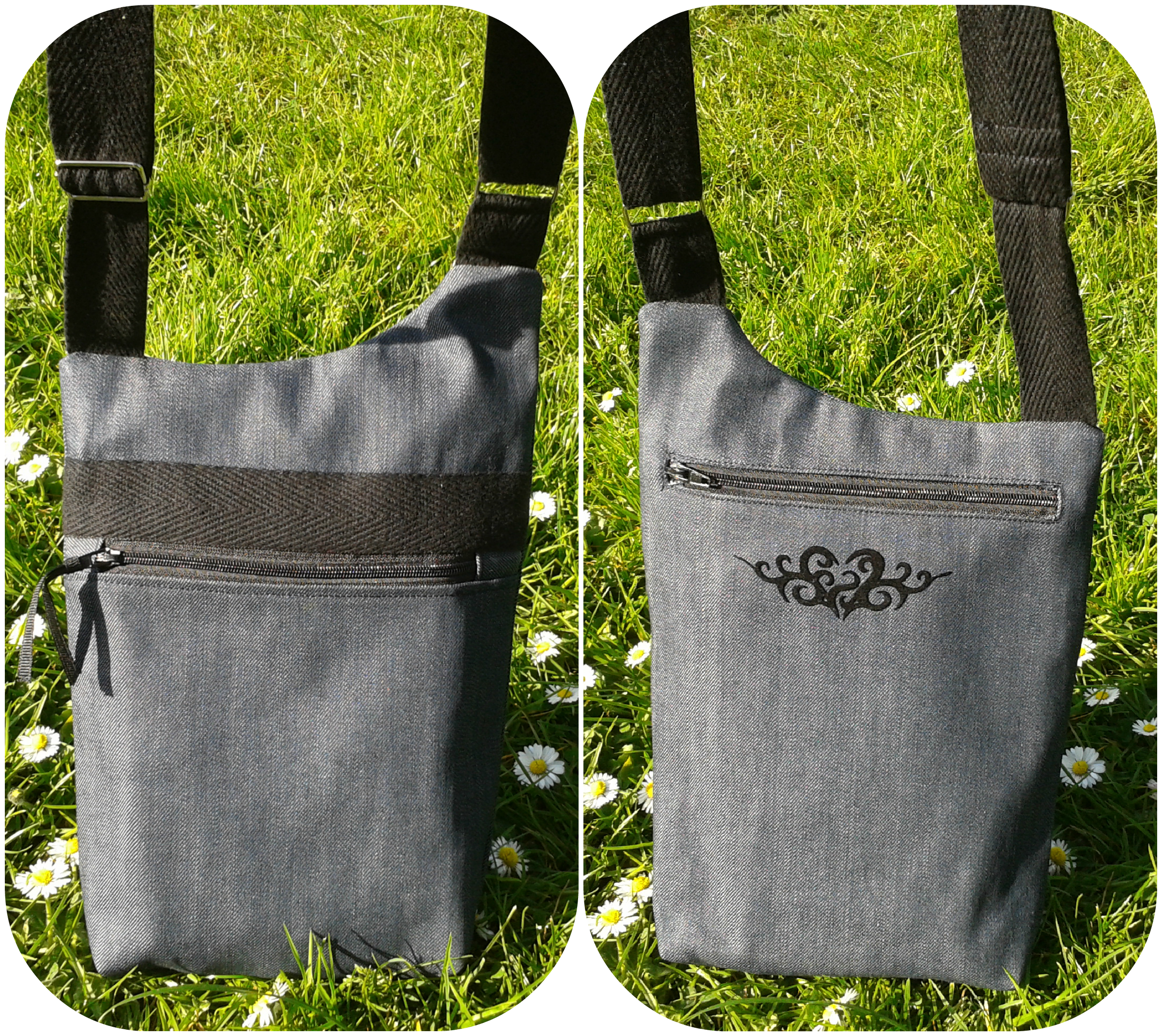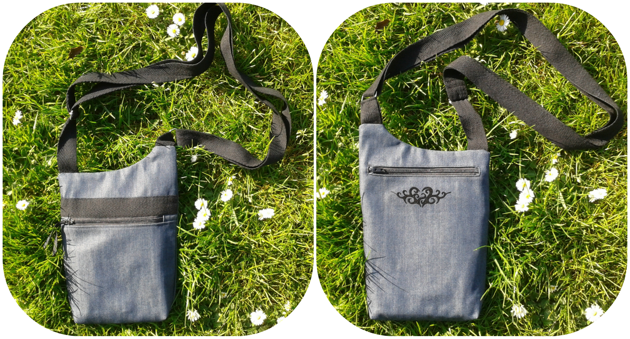 Il y a deux poches, l’une sur le devant et l’autre sur l’arrière qui permet d’accéder à tout l’intérieur du sac. Une bandoulière réglable permet d’ajuster la sangle à la longueur souhaitée. Un tuto bien expliqué et bien illustré est en ligne : comment créer une bandoulière ajustable. J’ai ajouté une petite arabesque au dos, c’est du flex aspect velours.