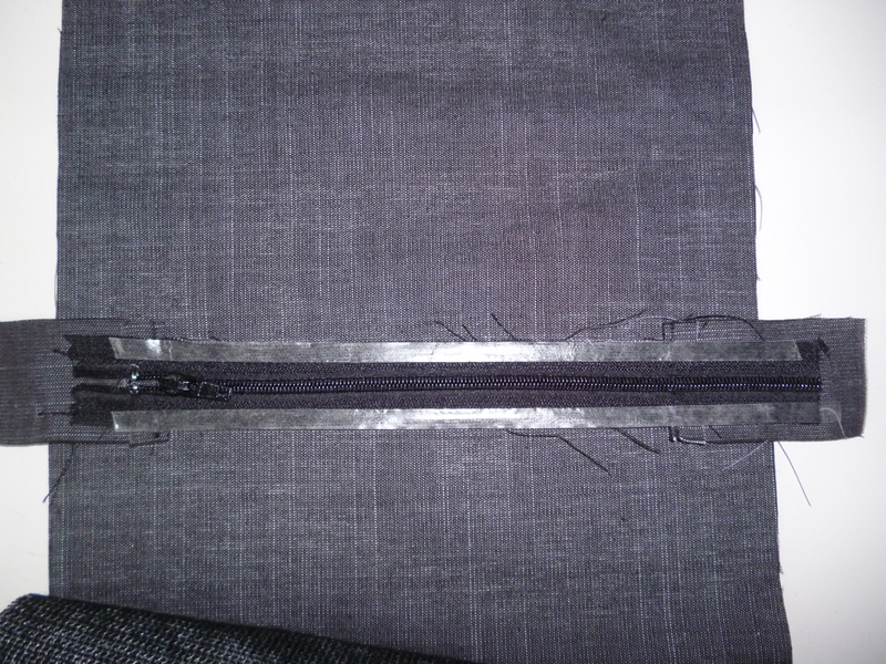 Petite astuce du jour : pour maintenir bien en place la fermeture, je positionne sur le tissu ou sur le zip un adhésif double-face qui est très étroit. Ca facilite grandement la couture du zip et ça permet d’éviter de mettre des épingles ou de bâtir.