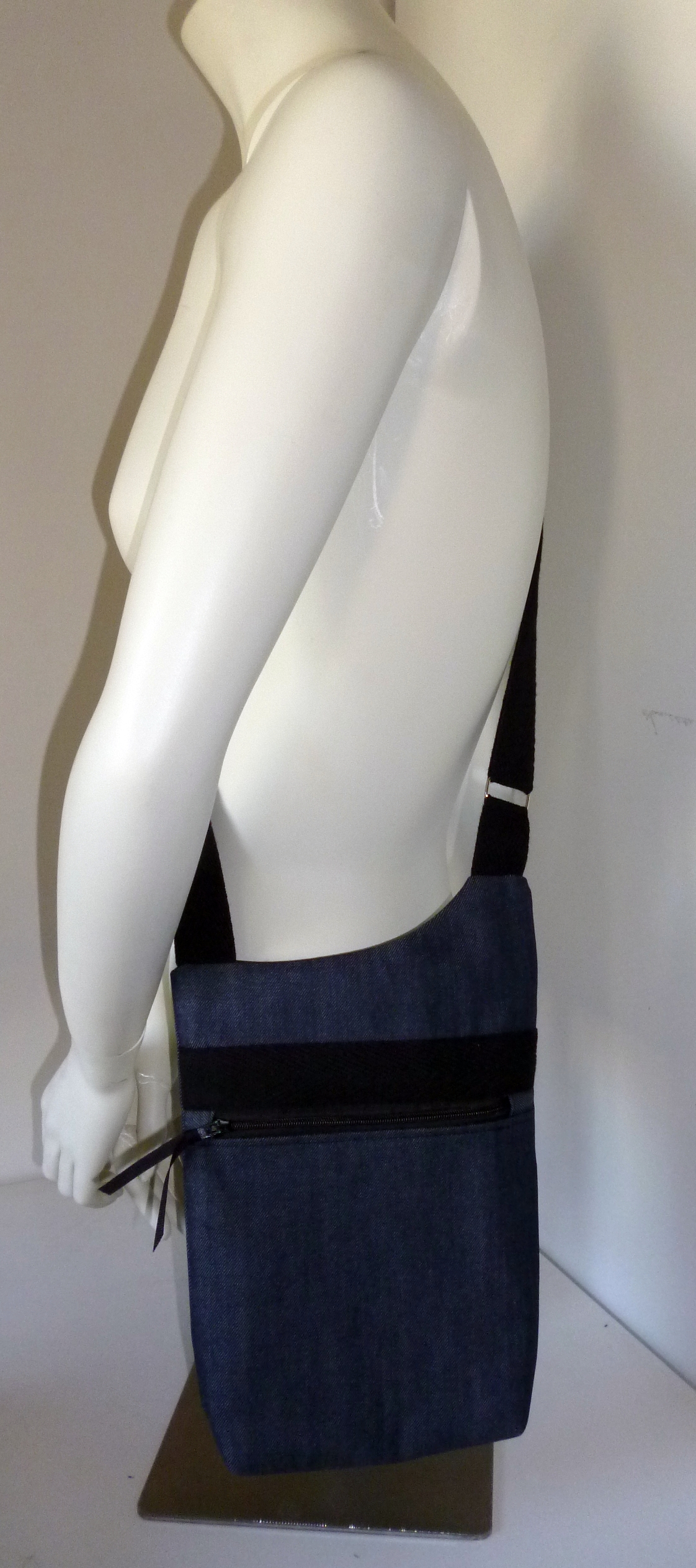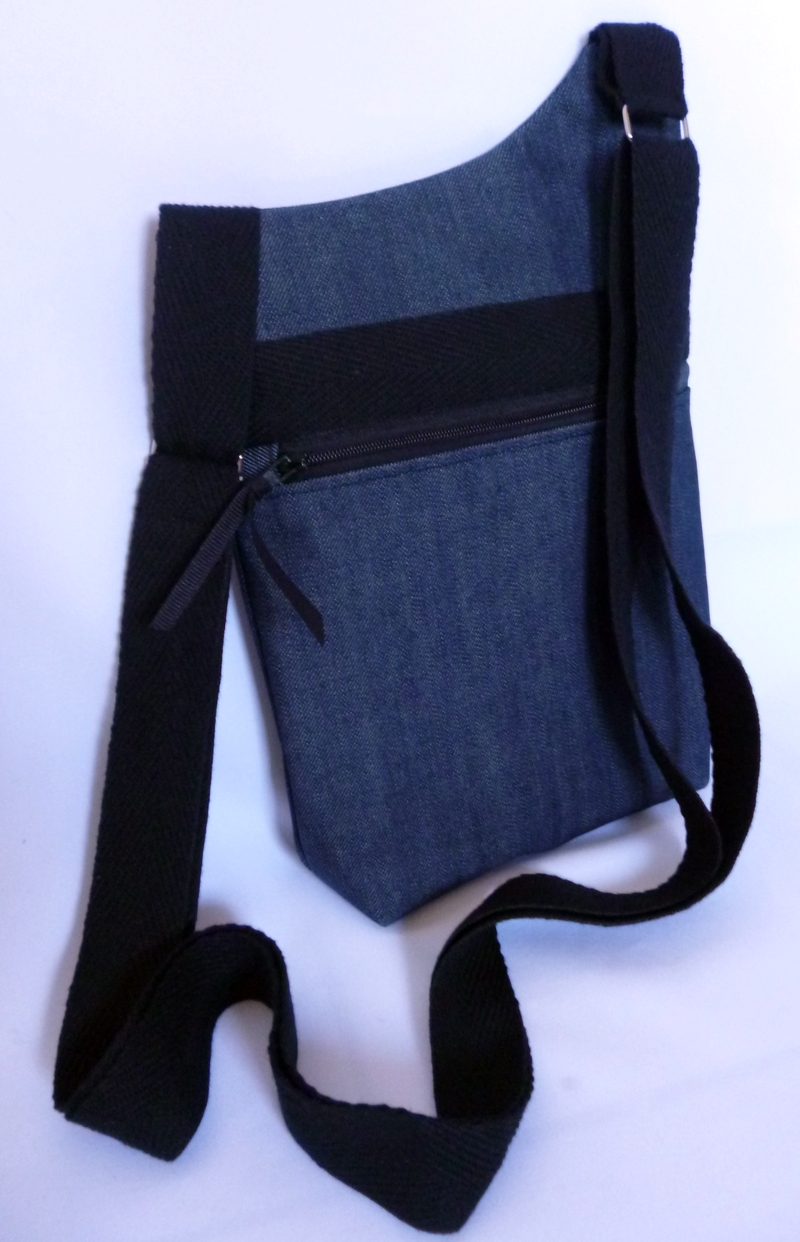 J’ai pris du tissu façon jean et de la sangle noir que j’avais en stock. J’ai eu beaucoup de plaisir à coudre ce sac car les étapes de montage diffèrent de ce que j’ai l’habitude de faire. L’assemblage de la doublure au sac et aux fermetures éclairs permet des finitions très nettes car le zip est pris en sandwich entre le tissu et la doublure.
