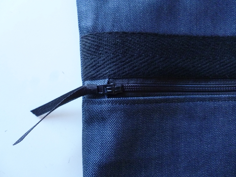 J’ai ajouté une petite languette qui facilite l’ouverture. J’ai tout simplement utilisé un ruban étroit (gros-grain) dont les extrêmités sont coupées en biais. Mais vous pouvez aussi fabriquer vous-même votre languette de fermeture éclair : voir tuto de Sacôtin.