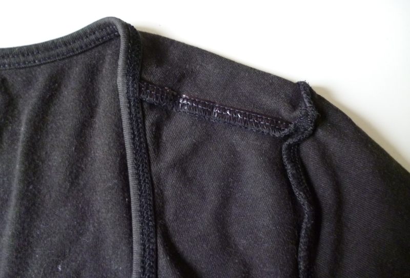 Le framilastic, je le place par exemple sur la couture d’épaule pour éviter que celle-ci ne se détende. L’élastique se pose au bord du tissu (côté épaule dos) :