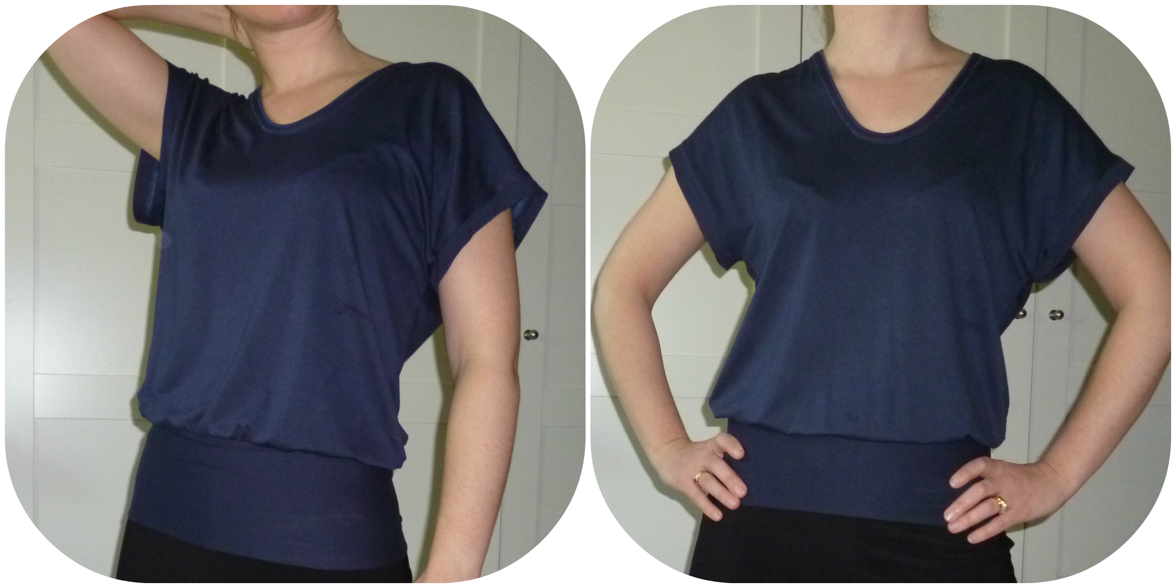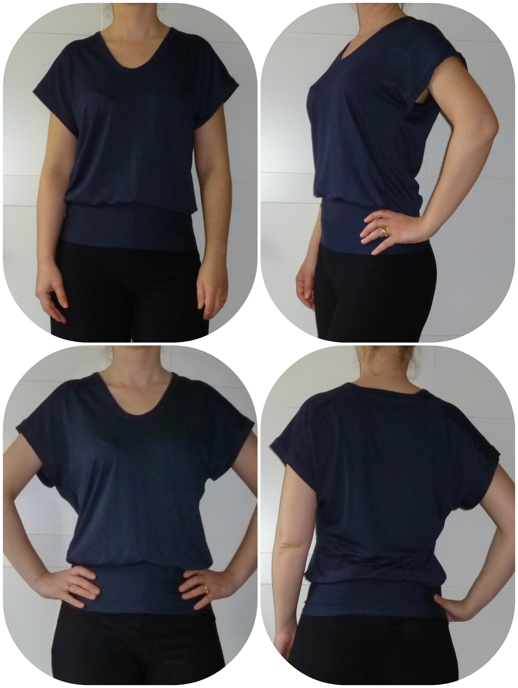 Au niveau des modifications, j’ai raccourci la hauteur du devant et du dos et j’ai ajouté une bande coupée en double, rétrécie en largeur pour donner davantage de blousant au t-shirt.