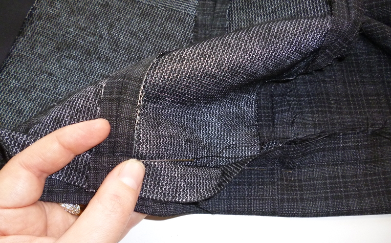 En ce qui concerne la méthode d’assemblage de la doublure au corps de la veste, on a procédé comme j’avais l’habitude de faire sauf que l’ouverture qui permet de retourner le tout sur l’endroit est placée à l’ourlet du milieu dos (j’avais pour habitude de laisser une ouverture dans une des manches). ça facilite ainsi l’assemblage de la doublure avec les manches car l’accès est plus aisé.