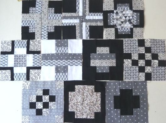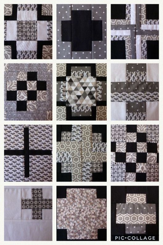 Le fait de coudre ces blocs, je vous avoue que c’est un sacré bon exercice pour apprivoiser les règles en inches ! C’est un super entrainement !!! Voici les dix premiers blocs que j’ai cousus (motifs croix) :