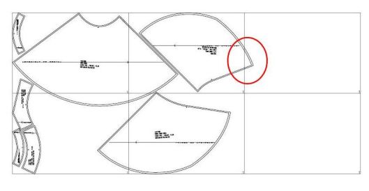 Grand reproche que je fais à Lekala : les pièces du patron sont imprimés intégralement, c’est-à-dire que les pièces qui sont normalement au pli du tissu, ne le sont pas ! Ici, on a du coup la pièce dos qui est en entier !!! C’est un vrai gâchis de papier !!! Regardez aussi ce que j’ai entouré en rouge : il n’y a qu’un petit bout du patron qui apparait sur la dernière page ! Alors très clairement je n’ai pas imprimé cette 5ème page en A0 ! J’ai juste prolongé les lignes du patron de la page précédente pour avoir mon patron en entier !