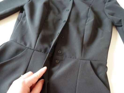 En revanche pour la jupe, j’ai du procéder à plusieurs ajustements successifs mais c’était couru d’avance ! J’ai découpé la partie jupe en taille 42 mais en gardant les pinces à l’emplacement de la taille 36 pour que celles-ci s’assemblent bien avec le corsage. J’ai ensuite réduit les côtés progressivement jusqu’à ce que ce soit à ma taille. Ne pouvant pas le faire sur moi-même, j’ai utilisé mon mannequin qui a les même mensurations que moi et j’ai moulé la jupe jusqu’à obtenir un résultat qui me convienne. Résultat obtenu ! Je suis conquise !