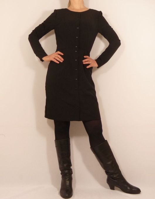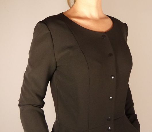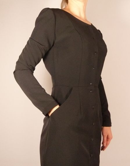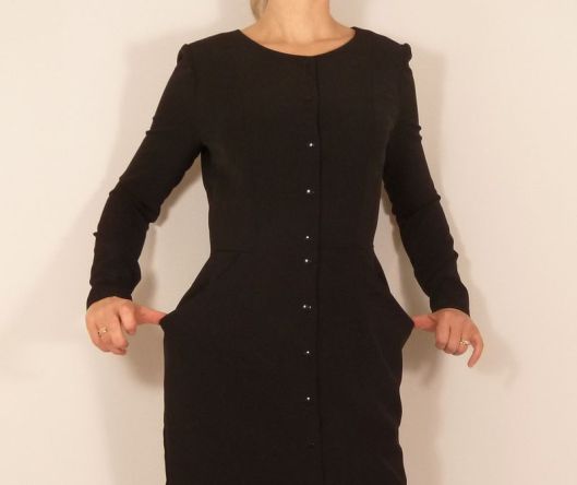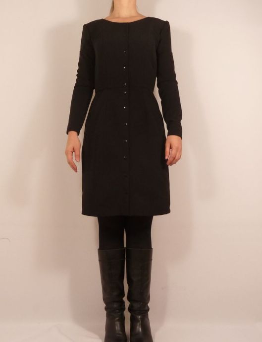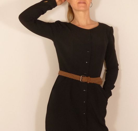 Il s’agit donc d’une robe à découpes bretelles boutonnée au devant, à manches papillon ou manches chemise et à jupe droite ou trapèze. La jupe droite a de grandes poches italiennes, la jupe trapèze a des poches prises dans la couture. Le corsage est doublé, les finitions intérieures sont soignées.