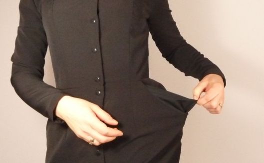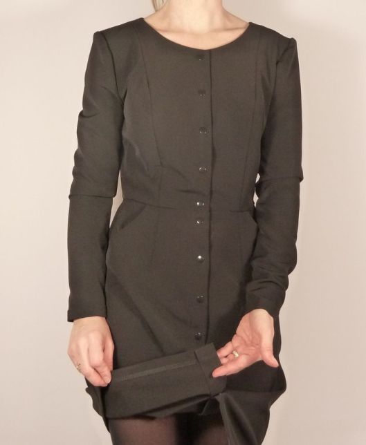 Il s’agit donc d’une robe à découpes bretelles boutonnée au devant, à manches papillon ou manches chemise et à jupe droite ou trapèze. La jupe droite a de grandes poches italiennes, la jupe trapèze a des poches prises dans la couture. Le corsage est doublé, les finitions intérieures sont soignées.