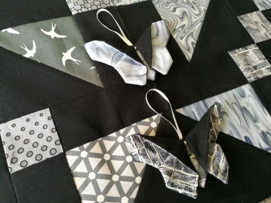 Le regarde se perd puis se retrouve, découvre différentes formes, cherche les tissus. C’est génial. Quel bonheur de participer et d’avoir une idée du travail commun. J’ai adoré travailler à nouveau en noir et gris. Bon week-end pascal 🙂