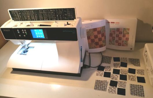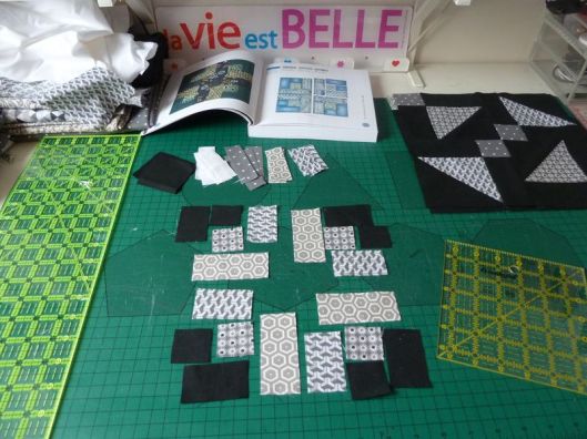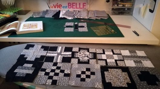 Ci-dessous on voit au premier plan mes 10 premiers blocs et au second plan ma table de travail avec mes tissus, mon livre et tous mes outils nécessaires !