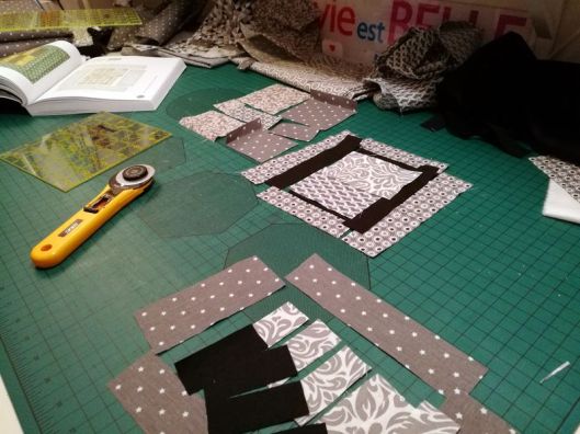 Ci-dessous, on aperçoit la disposition des morceaux du tout premier bloc, au-dessus, la découpe du bloc 2 et à droite, mon bloc fini de mon défi Quilting bee à la française !