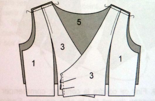 Sinon, il est indiqué de coudre sur 10 cm les pièces 1 et 3 depuis les épaules puis de piquer le devant au dos au niveau des épaules en laissant libre le bas des pièces 1 et 3 pour permettre par la suite de croiser les devants 3.