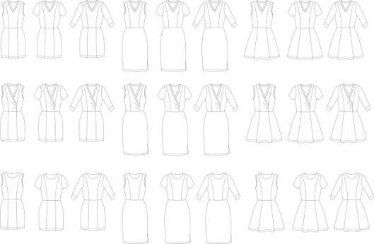 Je ne vais pas parler en détail de ce patron mais voici tout de même les schémas techniques : trois corsages et trois jupes différentes !