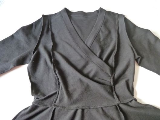 Le fait de d’avoir piqué les épaules ne permet pas de surjeter correctement cette courbe. La prochaine fois, je piquerai la couture d’épaules uniquement après avoir fini le devant du corsage.