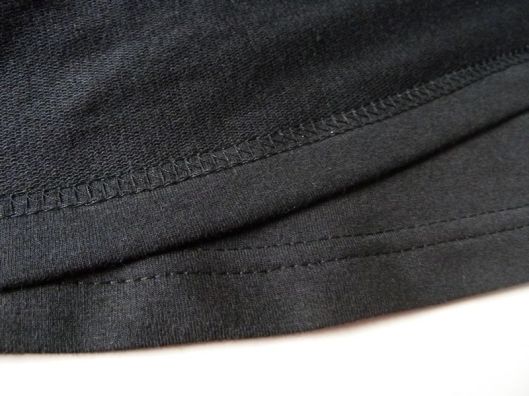 L’ourlet du bas de la jupe est également fini à la recouvreuse. J’ai juste réduit l’ourlet à 2 cm au lieu des 2,5 cm préconisés car plus l’ourlet est grand, plus l’arrondi sera difficile à former.