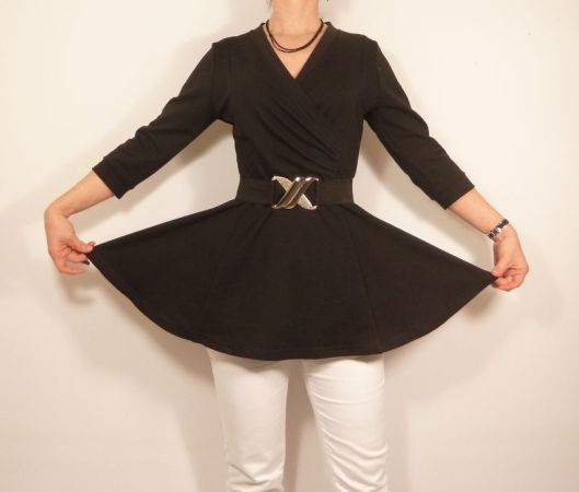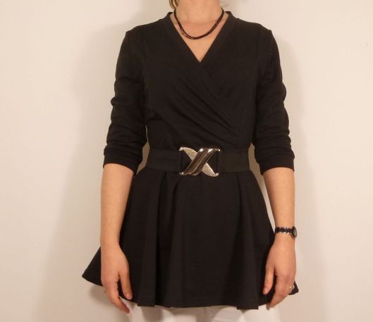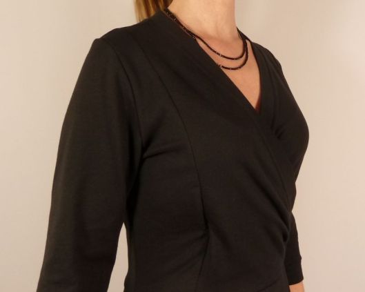 En ce qui me concerne, je n’ai pas hésité longtemps, c’est la version cache-coeur ou décolleté croisé, manche 3/4 et jupe évasée à découpes que j’ai cousue !