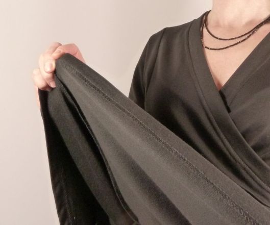 Une bande vient finir le décolleté du devant. Comme conseillé dans le livret, j’ai fait une petite surpiqûre près du bord. Je l’ai faite avec ma recouvreuse :