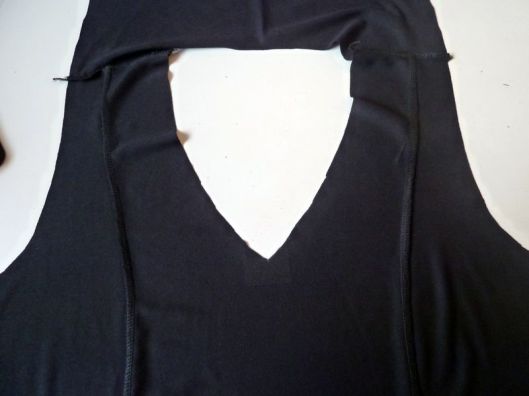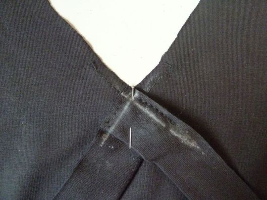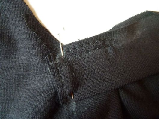 Il convient ensuite d’assembler le restant de la bande à l’encolure. Pour ce faire, on met d’abord une épingle au milieu dos puis au niveau de la couture des épaules. On vient ensuite étirer la bande au fur et à mesure :