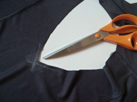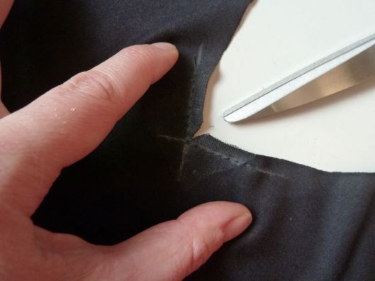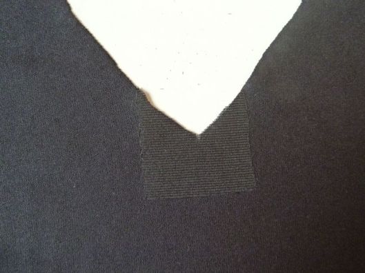 Pour renforcer cet angle, j’ai posé un entoilage thermocollant pour jersey très léger sur l’envers mais il n’y a pas d’obligation. Si vous avez peur que ça laisse une marque sur l’endroit, on peut aussi arrondir les angles ou mettre un droit-fil thermo (ou ne pas mettre de thermocollant !) :
